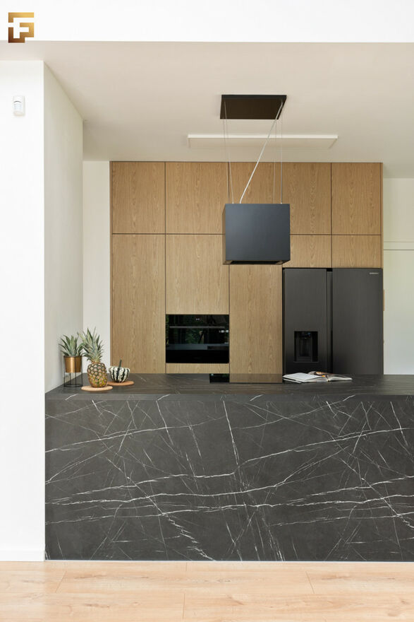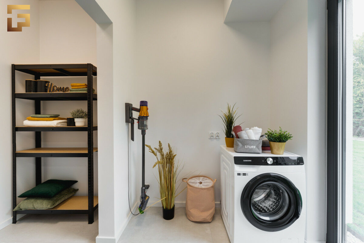 - kuchnia z wyspą, pralnia i schowek obok kuchni, dodatkowy schowek pod schodami.